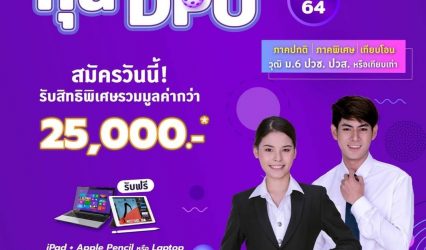 นักเรียน DPU รับสมัคร นศ.ใหม่ Dek 64 กับหลักสูตรพร้อมสร้างความเป็นมืออาชีพ EZ Webmaster April 26, 2021 มหาวิทยาลัยธุรกิจบัณฑิตย์ รับสมัครนักศึกษาใหม่ ปีการศึกษา 2564 หลักสูตรคุณภาพกับ 5 วิทยาลัย 6 คณะ ที่พร้อมให้ความรู้ด้านธุรกิจ และสร้างทักษะการทำงานให้ทุกคนเป็นมืออาชีพในทุกสายงาน สมัครวันนี้รับสิทธิพิเศษรวมมูลค่ากว่า 25,000 บาท พร้อมรับ iPad…