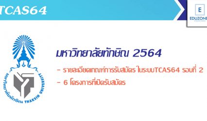 นักเรียนนักศึกษา #TCAS64 รวม 6 โครงการที่เปิดรับสมัคร รอบที่ 2 ม.ทักษิณ EZ Webmaster March 21, 2021 มหาวิทยาลัยทักษิณ เปิดรับสมัครคัดเลือกบุคคลเพื่อเข้าศึกษาต่อในระดับปริญญาตรี รอบที่ 2 ประจำปีการศึกษา 2564 โดยจะเปิดรับสมัครทั้งสิ้น 6 โครงการ ดังนี้ โครงการโควตาภูมิภาค จำนวนที่เปิดรับ : 251 ที่นั่ง…