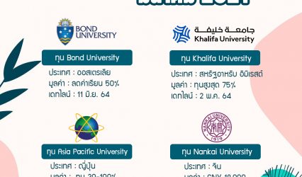 ทุนดีดี รวม 4 ทุนเรียนต่อระดับป.ตรี มีนาคม ปี 2021 EZ Webmaster March 20, 2021 สำหรับน้องๆ มัธยมศึกษาที่สนใจไปศึกษาต่อต่างประเทศ ในระดับปริญญาตรี วันนี้เราได้รวบรวมทุนการศึกษาในระดับปริญญาตรี ประจำปีการศึกษา 2021 ที่กำลังเปิดรับสมัครอยู่ในขณนี้มาฝากกันค่ะ 1.ทุน Bond University Bond University ประเทศออสเตรเลีย กำลังเปิดสำหรับผู้สมัครเรียนระดับปริญญาตรี ประจำปี…