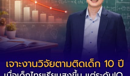 Blogข่าวเด่นครู-อาจารย์ เจาะงานวิจัยตามติดเด็ก 10 ปี: เมื่อเด็กไทยเรียนสูงขึ้น แต่ระดับสติปัญญา (IQ) กลับโตไม่ทันโลก EZ Webmaster March 18, 2026 เจาะงานวิจัยตามติดเด็ก 10 ปี: เมื่อเด็กไทยเรียนสูงขึ้น แต่ระดับสติปัญญา (IQ) กลับโตไม่ทันโลก แม้เด็กไทยจะมีโอกาสเรียนสูงขึ้นและอยู่ในระบบการศึกษานานขึ้น แต่คำถามสำคัญคือ “คุณภาพการเรียนรู้ของเด็กไทยเติบโตทันโลกหรือไม่” คำตอบจากงานวิจัยระยะยาวกว่า 10 ปี ชวนให้สังคมไทยต้องกลับมาทบทวนอย่างจริงจัง เมื่อผลการติดตามพัฒนาการเด็กพบว่า เด็กไทยกลุ่มตัวอย่างแม้จะโตขึ้นและเรียนสูงขึ้น…