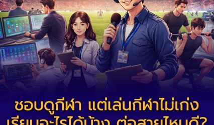 Blogนักเรียน ชอบดูกีฬา แต่เล่นกีฬาไม่เป็น เรียนอะไรได้บ้าง? EZ Webmaster March 20, 2026 ชอบดูกีฬา แต่เล่นกีฬาไม่เป็น เรียนอะไรได้บ้าง? ในมุมมองของหลายคน “สายกีฬา” มักถูกผูกติดกับภาพของนักกีฬาที่ต้องมีทักษะทางร่างกายโดดเด่น แข่งขันเก่ง และมีผลงานในสนาม แต่ในความเป็นจริงแล้ว อุตสาหกรรมกีฬาในปัจจุบันเติบโตอย่างมาก และเปิดโอกาสให้กับคนหลากหลายความสามารถ ไม่จำเป็นต้องเป็นนักกีฬามืออาชีพก็สามารถทำงานในสายนี้ได้ สำหรับนักเรียนระดับมัธยมปลายที่ “ชอบดูกีฬา” ติดตามการแข่งขันอย่างสม่ำเสมอ วิเคราะห์เกมได้…