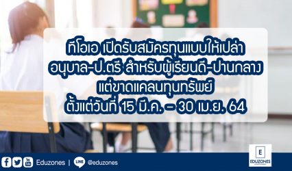 ทุนดีดี ทีโอเอ เปิดรับสมัครทุนแบบให้เปล่าอนุบาล-ป.ตรี สำหรับผู้เรียนดี-ปานกลางแต่ขาดแคลนทุนทรัพย์ ตั้งแต่วันที่ 15 มี.ค. – 30 เม.ย. 64 EZ Webmaster March 15, 2021 กลุ่มบริษัท ทีโอเอ โดยมูลนิธิคุณแม่ลี้กิมเกียว ตั้งคารวคุณ เปิดรับสมัครทุนการศึกษา ประจำปีการศึกษา 2564 ตั้งแต่ระดับชั้นอนุบาลจนถึงระดับปริญญาตรี สำหรับผู้เรียนที่เรียนดีและเรียนปานกลาง ที่มีความประพฤติดี มีความกตัญญู แต่ขาดแคลนทุนทรัพย์ ทั้งนี้ผู้ที่ผ่านการพิจารณาให้ได้รับทุนการศึกษา จะได้รับทุนต่อเนื่องจนจบแต่ละช่วงชั้นการศึกษา โดยเป็นทุนแบบให้เปล่าไม่ต้องชดใช้ทุนคืนแต่อย่างใด ซึ่งจะเปิดรับสมัครตั้งแต่วันที่…