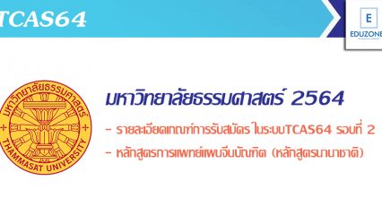 นักเรียนนักศึกษา #TCAS64 แพทย์แผนจีนบัณฑิต (หลักสูตรนานาชาติ) ม.ธรรมศาสตร์ เปิดรับสมัครนศ.ป.ตรี รอบที่ 2 โควตา ตั้งแต่วันที่ 5-18 มี.ค. 64 EZ Webmaster March 16, 2021 มหาวิทยาลัยธรรมศาสตร์ เปิดรับสมัครบุคคลเพื่อสอบคัดเลือกเข้าศึกษาในโครงการปริญญาตรี ภาคพิเศษ หลักสูตรการแพทย์แผนจีนบัณฑิต (หลักสูตรนานาชาติ) วิทยาลัยแพทยศาสตร์นานาชาติจุฬาภรณ์ มหาวิทยาลัยธรรมศาสตร์ รอบที่ 2 โควตา ประจำปีการศึกษา 2564 โดยจะเปิดรับสมัครตั้งแต่วันที่ 5-18 มีนาคม 2564…