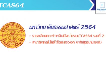 นักเรียนนักศึกษา #TCAS64 เทคโนโลยีหัวใจและทรวงอก ม.ธรรมศาสตร์ (นานาชาติ) เปิดรับสมัครนศ.ป.ตรี รอบที่ 2 โควตา ตั้งแต่วันที่ 5-18 มี.ค. 64 EZ Webmaster March 16, 2021 มหาวิทยาลัยธรรมศาสตร์ เปิดรับสมัครคัดเลือกบุคคลเพื่อเข้าศึกษาต่อใน โครงการปริญญาตรีภาคพิเศษ หลักสูตรวิทยาศาสตรบัณฑิต สาขาวิชาเทคโนโลยีหัวใจและทรวงอก (หลักสูตรนานาชาติ) วิทยาลัยแพทยศาสตร์นานาชาติจุฬาภรณ์ มหาวิทยาลัยธรรมศาสตร์ รอบที่ 2 โควตา ประจำปีการศึกษา 2564 โดยจะเปิดรับสมัครวันที่ 5 –…
