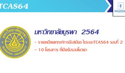 นักเรียนนักศึกษา #TCAS64 10 โครงการ ที่เปิดรับรอบที่ 2 โควตา มหาวิทยาลัยบูรพา EZ Webmaster March 14, 2021 มหาวิทยาลัยบูรพา เปิดรับสมัครคัดเลือกบุคคลเพื่อเข้าศึกษาต่อในระดับปริญญาตรี รอบที่ 2 โควตา ประจำปีการศึกษา 2564 โดยมีโครงการที่เปิดรับทั้งสิ้น 10 โครงการ ดังนี้ 1.โครงการรับตรง คณะศิลปกรรมศาสตร์ จำนวนที่เปิดรับ :…