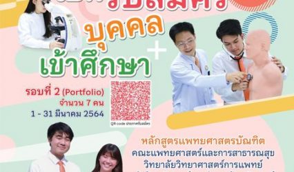 นักเรียน คณะแพทยศาสตร์และการสาธารณสุข วิทยาลัยวิทยาศาสตร์การแพทย์เจ้าฟ้าจุฬาภรณ์ เปิดรับสมัครบุคคลเข้าศึกษา ประจำปีการศึกษา 2564 รอบที่ 2 (Portfolio) EZ Webmaster March 5, 2021 หลักสูตรแพทยศาสตรบัณฑิต (หลักสูตรใหม่ พ.ศ.2563) คณะแพทยศาสตร์และการสาธารณสุข วิทยาลัยวิทยาศาสตร์การแพทย์เจ้าฟ้าจุฬาภรณ์ ราชวิทยาลัยจุฬาภรณ์ (PCCMS-CRA) โดยความร่วมมือกับ UCL สหราชอาณาจักร (iBSc/MD Programme) เปิดรับสมัครบุคคลเข้าศึกษา ประจำปีการศึกษา 2564 รอบที่…