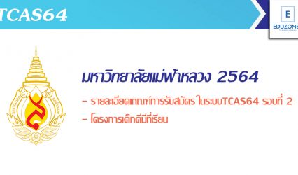 นักเรียนนักศึกษา #TCAS64 ม.แม่ฟ้าหลวง เปิดรับสมัครนศ.ป.ตรี รอบที่ 2 โครงการเด็กดีมีที่เรียน ตั้งแต่วันที่ 1-15 มี.ค. 64 EZ Webmaster February 17, 2021 มหาวิทยาลัยแม่ฟ้าหลวง เปิดรับสมัครคัดเลือกบุคคลเพื่อเข้าศึกษาต่อในระดับปริญญาตรี รอบที่ 2 ระบบโควตา โครงการพิเศษเพื่อส่งเสริมเด็กดีมีที่เรียน ประจำปีการศึกษา 2564 โดยจะเปิดรับสมัครตั้งแต่วันที่ 1-15 มีนาคม 2564 สาขาวิชาที่เปิดรับสมัคร -30 สาขาวิชา…