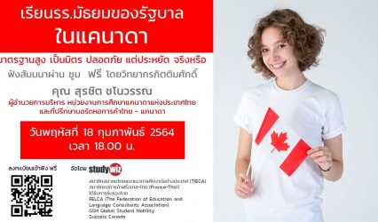 นักเรียน สัมมนาเรียนมัธยมในโรงเรียนของรัฐบาลในประเทศแคนาดา EZ Webmaster February 15, 2021 ฟังสัมมนาฟรีผ่าน ซูม เรียนมัธยมในโรงเรียนของรัฐบาลในประเทศแคนาดา มาตรฐานและความปลอดภัยสูง ผู้คนเป็นมิตร แต่ค่าใช้จ่ายไม่สูง จริงหรือ? โดยวิทยากรกิตติมศักดิ์ คุณ สุรชิต ชโนวรรณ ผู้อำนวยการบริหาร หน่วยงานการศึกษาแคนาดาแห่งประเทศไทย และที่ปรึกษาบอร์ดหอการค้าไทย – แคนาดา วันพฤหัสที่ 18 กุมภาพันธ์ 2564…