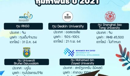 ทุนดีดี 5 ทุนเรียนต่อระดับ “บัณฑิตศึกษา” กุมภาพันธ์ ปี 2021 EZ Webmaster February 14, 2021 หลังเรียนจบในระดับปริญญาตรีแล้ว ก็จะเห็นว่าหลายคนนิยมเดินทางไปเรียนต่อในระดับบัณฑิตศึกษา (ปริญญาโท-เอก) ที่ต่างประเทศกันในสาขาต่างๆ กัน ซึ่งการเรียนต่อที่ต่างประเทศในระดับบัณฑิตศึกษานั้นก็มีทุนการศึกษาจากหลากหลายโครงการจากหลายมหาวิทยาลัยในหลายประเทศที่เปิดเสนอให้ทุนช่วยเหลือแก่ผู้ที่สนใจ วันนี้เราจึงมี 5 ทุนเรียนต่อในระดับบัณฑิตศึกษา ที่กำลังเปิดรับสมัครอยู่มาฝากกันค่ะ 1.ทุน ANSO สถาบัน Alliance of…