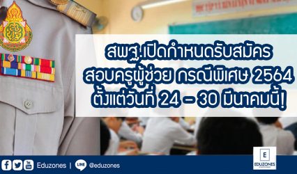 ครู-อาจารย์ สพฐ.เปิดกำหนดรับสมัครสอบครูผู้ช่วย กรณีพิเศษ 2564 ตั้งแต่วันที่ 24 – 30 มีนาคมนี้ EZ Webmaster February 9, 2021 เมื่อวันที่ 9 กุมภาพันธ์ 2564 ที่ผ่านมา ทางสำนักงานคณะกรรมการการศึกษาขั้นพื้นฐาน (สพฐ.) ส่งหนังสือถึงศึกษาธิการจังหวัดทุกจังหวัด เรื่องกําหนดการคัดเลือกบุคคลเพื่อบรรจุและแต่งตั้งเข้ารับราชการ เป็นข้าราชการครูและบุคลากรทางการศึกษา ตําแหน่งครูผู้ช่วย กรณีที่มีความจําเป็นหรือมีเหตุพิเศษ สังกัดสํานักงานคณะกรรมการการศึกษาขั้นพื้นฐาน ปี พ.ศ. 2564…