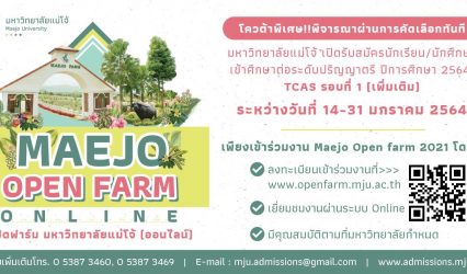 นักเรียน แม่โจ้เปิดรับสมัครเข้าศึกษาต่อระดับปริญญาตรี 2564 (โควตาพิเศษ) ในงาน MAEJO OPEN FARM 2021 EZ Webmaster January 13, 2021 แม่โจ้..เปิดรับสมัครเข้าศึกษาต่อระดับปริญญาตรี 2564 (โควตาพิเศษ) รับนักเรียน/นักศึกษาทั่วประเทศ..เพียงลงทะเบียนเข้างาน หรือเที่ยวชมงานระบบ Online ที่ www.openfarm.mju.ac.th ในงาน MAEJO OPEN FARM 2021 ในระหว่างวันที่ 14-31 มกราคม…