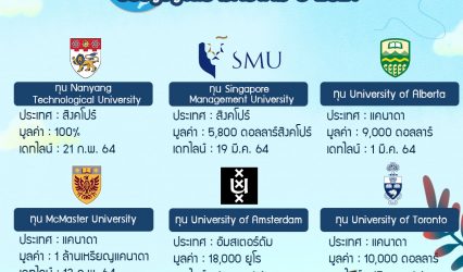 นักเรียนนักศึกษา อัปเดตทุนเรียนต่อระดับป.ตรี มกราคม ปี 2021 EZ Webmaster January 10, 2021 สำหรับน้องๆ ในระดับมัธยมศึกษาที่สนใจอยากไปเรียนต่อต่างประเทศ วันนี้เราได้รวบรวมทุนเรียนต่อในระดับปริญญาตรี ทั้ง 6 ทุนการศึกษา จาก 6 มหาวิทยาลัยมาฝากกันค่ะ 1.ทุน Nanyang Technological University ทุน…