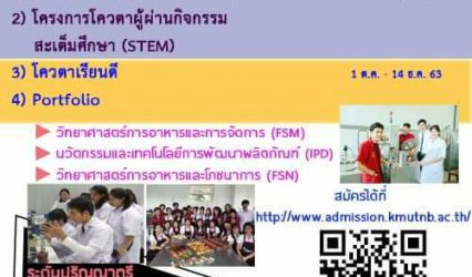 นักเรียน คณะอุตสาหกรรมเกษตร มจพ. วิทยาเขตปราจีนบุรี รับสมัครนักศึกษาใหม่ ปี’64 (TCAS 64) รอบที่ 1 (Portfolio) EZ Webmaster September 22, 2020 คณะอุตสาหกรรมเกษตร มหาวิทยาลัยเทคโนโนลยีพระจอมเกล้าพระนครเหนือ วิทยาเขตปราจีนบุรี เปิดรับสมัครนักศึกษาใหม่ประจำปีการศึกษา 2564 (TCAS 64) รอบที่ 1 (Portfolio) โดยเปิดรับสมัคร 3 สาขา คือ 1) สาขาวิชาวิทยาศาสตร์การอาหารและการจัดการ…