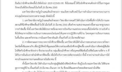นักศึกษา คำแถลงของอธิการบดี เรื่อง การติดเชื้อไวรัสโคโรน่า 2019 (COVID-19) ของนักศึกษามหาวิทยาลัยราชภัฏบ้านสมเด็จเจ้าพระยา EZ Webmaster March 25, 2020 คำแถลงของอธิการบดี เรื่อง การติดเชื้อไวรัสโคโรน่า 2019 (COVID-19) ของนักศึกษามหาวิทยาลัยราชภัฏบ้านสมเด็จเจ้าพระยา
