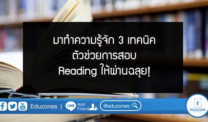 Blog มาทำความรู้จัก 3 เทคนิค ตัวช่วยการสอบ Reading ให้ผ่านฉลุย! EZ Webmaster March 16, 2020 พาร์ท Reading หรือการอ่านนั้นเป็นอีกพาร์ทสำคัญที่เรามักจะเจอในข้อสอบวัดระดับภาษาอังกฤษ ไม่ว่าจะเป็นข้อสอบของน้องๆ ที่เตรียมเข้ามหาวิทยาลัยอย่าง Gat Onet หรือข้อสอบวัดระดับสำหรับผู้ที่จะสมัครเรียนต่อหรือสมัครงานอย่าง TOEIC IELTS ต่างๆ ล้วนมีพาร์ทการสอบ Reading อยู่ด้วยทั้งนั้น ซึ่งพาร์ทการอ่านนี้หลายคนก็เป็นกังวลเพราะด้วยข้อสอบที่ยาวและเวลาที่ไม่มากก็จะทำให้หลายคนอ่านไม่ทันและเสียคะแนนในการสอบไป วันนี้เราจึงนำ…