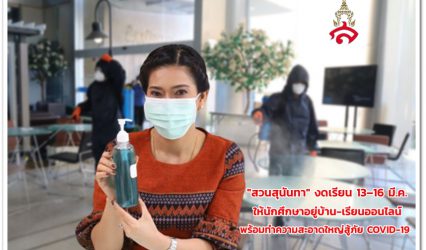 นักศึกษา “สวนสุนันทา” งดเรียน 13 – 16 มี.ค. ให้นักศึกษาอยู่บ้าน – เรียนออนไลน์ พร้อมทำความสะอาดใหญ่สู้ภัย COVID-19 tui sakrapee March 12, 2020 รองศาสตราจารย์ ดร.ชุติกาญจน์ ศรีวิบูลย์ รักษาราชการอธิการบดีมหาวิทยาลัยราชภัฏสวนสุนันทา (มร.สส.) เปิดเผยว่า ในสถานการณ์ระบาดรุนแรงของเชื้อ COVID-19 มร.สส.ได้ตระหนักถึงความสำคัญของปัญหา คำนึงถึงสวัสดิภาพและความปลอดภัย จึงได้ออกประกาศให้งดการเรียนการสอนและกิจกรรมของนักศึกษาทั้งหมดระหว่างวันที่ 13 – 16 มีนาคม 2563…