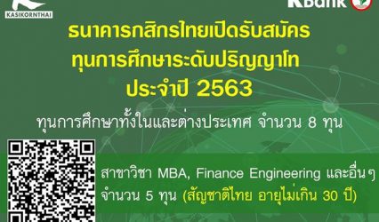 ทุนดีดี ทุนธนาคารกสิกรไทยระดับปริญญาโท เรียนต่อในมหาวิทยาลัยชั้นนำทั้งในและต่างประเทศ tui sakrapee March 4, 2020 โอกาสดีๆจากธนาคารกสิกรไทย สำหรับพนักงานและบุคคลภายนอกที่สนใจทุนการศึกษาระดับปริญญาโท จำนวน 8 ทุน ในมหาวิทยาลัยชั้นนำทั้งในและต่างประเทศได้มาถึงแล้ว! เปิดรับสมัครตั้งแต่วันนี้ – วันพฤหัสบดีที่ 16 เมษายน 2563 ดูรายละเอียดเพิ่มเติม และสมัครได้เลยผ่านการ Scan QR…