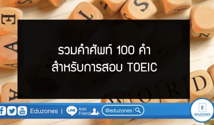 Blog รวมคำศัพท์ 100 คำสำหรับการสอบ TOEIC EZ Webmaster February 19, 2020 ในการสอบ TOEIC นั้นนอกจากทักษะด้านไวทยากรณ์ และโครงสร้างประโยค และการฟังที่ต้องฝึกฝนแล้ว “คำศัพท์” เองก็เป็นพื้นฐานที่จะช่วยให้การทำข้อสอบได้มากขึ้น เพราะการรู้จักคำศัพท์นั้นจะเป็นตัวช่วยในการทำข้อสอบนพาร์ทอื่นๆ ให้ได้ดียิ่งขึ้น วันนี้เราจึงมีลิสต์คำศัพท์พร้อมตัวอย่างประโยค ที่จะมาช่วยให้การสอบ TOEIC มาฝากกันค่ะ หมวด…