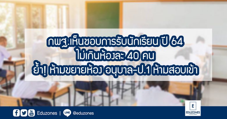 EZ Webmaster September 20, 2020 กพฐ.เห็นชอบการรับนักเรียน ปี 64 ไม่เกินห้องละ 40 คน ย้ำ! ห้ามขยายห้อง อนุบาล-ป.1 ห้ามสอบเข้า EZ Webmaster September 20, 2020 ที่ประชุม กพฐ.เห็นชอบการรับนักเรียน ปีการศึกษา 2564 จำกัดจำนวนรับไม่เกินห้องละ 40 คน พร้อมเน้นย้ำห้ามขยายจำนวนห้องและจำนวนนักเรียนต่อห้อง โดยชั้นอนุบาล และ ป.1 ไม่มีการสอบเข้าทุกกรณี โดยเตรียมเสนอ รมว.ศธ.พิจารณาต่อไป เมื่อวันที่ 18 กันยายน 2563 ที่ผ่านมา ประธานคณะกรรมการการศึกษาขั้นพื้นฐาน (กพฐ.) รศ.ดร.เอกชัย กี่สุขพันธ์ เปิดเผยภายหลังการประชุม กพฐ. ว่า ที่ประชุมได้มีการพิจารณาร่างนโยบายและแนวปฏิบัติเกี่ยวกับการรับนักเรียน สังกัดสำนักงานคณะกรรมการการศึกษาขั้นพื้นฐาน(สพฐ.) ปีการศึกษา 2564 ซึ่งโดยหลักการจะเหมือนกับปีการศึกษา… Continue Reading