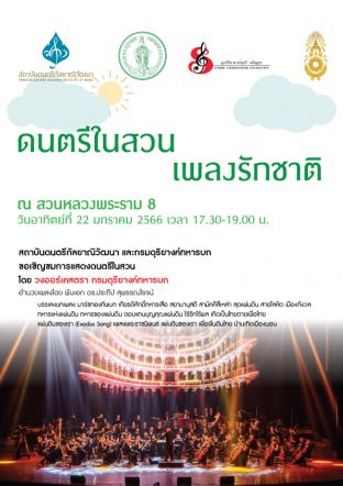 tui sakrapee January 21, 2023 สถาบันดนตรีกัลยาณิวัฒนา และกองดุริยางค์ทหารบก ชวนร่วมชม “ดนตรีในสวน…เพลงรักชาติ” อาทิตย์ที่ 22 ม.ค.นี้ ณ สวนหลวงพระราม 8 tui sakrapee January 21, 2023 สถาบันดนตรีกัลยาณิวัฒนา และกองดุริยางค์ทหารบก มีความยินดีขอเชิญทุกท่านร่วมชมการแสดง “ดนตรีในสวน…เพลงรักชาติ” ณ สวนหลวงพระราม 8 บางยี่ขัน บางพลัด กทม เวลา 17.30-19.00 น. บรรเลงโดยวงออร์เคสตรา กรมดุริยางค์ทหารบก อำนวยเพลงโดย พันเอก ดร.ประทีป สุพรรณโรจน์ บรรเลงบทเพลง มาร์ชกองทัพบก เกียรติศักดิ์ทหารเสือ สยามานุสติ สามัคคีสี่เหล่า สุดแผ่นดิน สายโลหิต เมืองกังวล ทหารแห่งแผ่นดิน ทหารของแผ่นดิน ตอบแทนบุญคุณแผ่นดิน ไร้รักไร้ผล เกิดเป็นไทยตายเพื่อไทย… Continue Reading