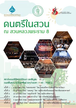 สถาบันดนตรีกัลยาณิวัฒนา ขอเชิญชมดนตรีในสวน ทุกวันอาทิตย์ ระหว่างเวลา 17.30 – 19.00 น. เริ่ม 8 มกราคมนี้ ณ  สวนหลวงพระราม 8  ดนตรีในสวน เป็นการแสดงดนตรีในสวนหลวงพระราม 8 เป็นประจำทุกวันอาทิตย์ แสดงทั้งหมด 6 ครั้ง ได้แก่ วันอาทิตย์ที่ 8, 15, 22, 29 มกราคม 2566 วันที่ 5 และ…