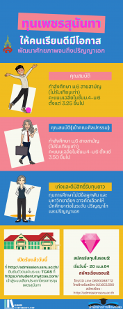 EZ Webmaster November 20, 2025 ทุน “เพชรสุนันทา” มรภ.สวนสุนันทา TCAS69 รอบที่ 2 Quota EZ Webmaster November 20, 2025 ทุน “เพชรสุนันทา” มรภ.สวนสุนันทา ทุนฟรีค่าเทอม 30,000 บาท/ปี รับ 57 ทุน (TCAS 69) — ไม่มีข้อผูกพัน! มหาวิทยาลัยราชภัฏสวนสุนันทา เปิดรับสมัครทุนการศึกษา “โครงการเพชรสุนันทา” สำหรับนักเรียน ม.6 ที่มีผลการเรียนดี มีความสามารถโดดเด่น และมีผลงาน Portfolio โดยทุนนี้ ยกเว้นค่าธรรมเนียมการศึกษาและค่าหน่วยกิต มูลค่าประมาณ 30,000 บาท/คน/ปี (ต่อเนื่องทุกปีตลอดหลักสูตร) ทุนนี้ ไม่มีข้อผูกพัน และหากมีผลงานโดดเด่น อาจได้รับคัดเลือกให้เรียนต่อในระดับ… Continue Reading