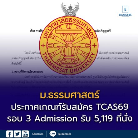 EZ Webmaster April 8, 2026 ม.ธรรมศาสตร์ ประกาศเปิดรับสมัคร TCAS69 รอบ 3 Admission แล้ว! รวม 5,119 ที่นั่ง EZ Webmaster April 8, 2026 📣 ม.ธรรมศาสตร์ เปิดรับ TCAS69 รอบ 3 Admission แล้ว! รวม 5,119 ที่นั่ง มหาวิทยาลัยธรรมศาสตร์ ประกาศเปิดรับสมัครคัดเลือกนักศึกษาใหม่ ระดับปริญญาตรี ผ่านระบบ TCAS รอบที่ 3 (Admission) ประจำปีการศึกษา 2569 โดยเปิดรับรวมทั้งสิ้น 5,119 ที่นั่ง ครอบคลุมหลายคณะและสาขาวิชา 🎓 คุณสมบัติผู้สมัคร นักเรียนชั้น ม.6 หรือเด็กซิ่ว ใช้ผลคะแนน: GPAX… Continue Reading