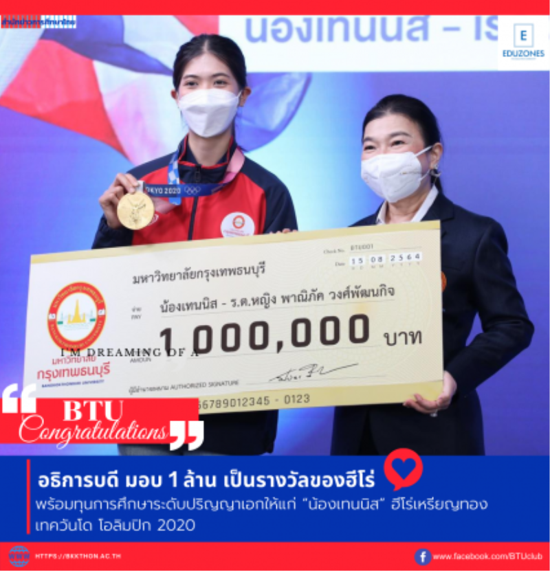 tui sakrapee August 15, 2021 “น้องเทนนิส” ฮีโร่เหรียญทองเทควันโด” โอลิมปิก 2020 สุดซึ้งคุณแม่อธิการบดี ม.กรุงเทพธนบุรี ดูแลอย่างอบอุ่น มอบเงินรางวัล 1 ล้านบาท พร้อมทุนการศึกษาระดับปริญญาเอก tui sakrapee August 15, 2021 “น้องเทนนิส” ฮีโร่เหรียญทองเทควันโด” โอลิมปิก 2020 สุดซึ้งคุณแม่อธิการบดี ม.กรุงเทพธนบุรี ดูแลอย่างอบอุ่น มอบเงินรางวัล 1 ล้านบาท พร้อมทุนการศึกษาระดับปริญญาเอก รศ.ดร.บังอร เบ็ญจาธิกุล อธิการบดีมหาวิทยาลัยกรุงเทพธนบุรี มอบเงินรางวัลจำนวน 1 ล้านบาท และมอบทุนการศึกษาระดับปริญญาเอกให้แก่ “น้องเทนนิส” เรืออากาศตรีหญิง พาณิภัค วงศ์พัฒนกิจ พร้อมกล่าวชื่นชมในความสำเร็จของ “น้องเทนนิส” ด้านการกีฬา ซึ่งการมอบรางวัลดังกล่าว เพื่อเป็นขวัญกำลังใจที่ได้รับรางวัลเหรียญทองกีฬาเทควันโดจากการเข้าร่วมแข่งขันกีฬาโอลิมปิกเกมส์ 2020 ครั้งที่ 32 ประเทศญี่ปุ่น และถือเป็นการสร้างชื่อเสียงเกียรติประวัติให้แก่ครอบครัว… Continue Reading