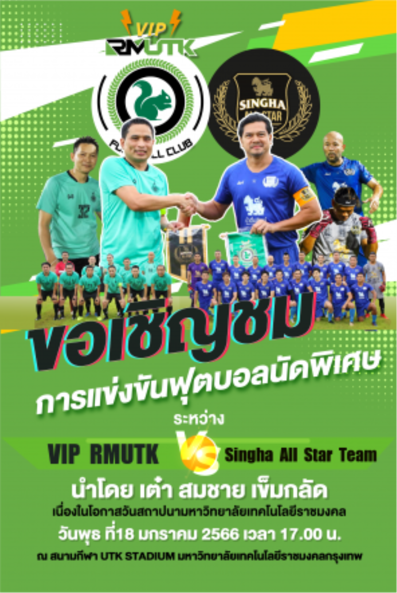 tui sakrapee January 20, 2023 มิตรภาพอบอุ่น! มทร.กรุงเทพ ฉลองครบรอบ 18 ปี จัดดวลแข้งกระชับมิตร VIP RMUTK ปะทะ SINGHA ALL STAR tui sakrapee January 20, 2023 มทร.กรุงเทพ ฉลองครบรอบ 18 ปี จัดดวลแข้งกระชับมิตร VIP RMUTK ปะทะ SINGHA ALL STAR ท่ามกลางบรรยากาศที่เต็มไปด้วยความสนุกสนานและอบอุ่นจากกองเชียร์และผู้เล่นทั้งสองทีม เมื่อวันที่ 18 ม.ค. 2566 ที่มหาวิทยาลัยเทคโนโลยีราชมงคล กรุงเทพ ย่านทุ่งมหาเมฆ รศ.ดร.พิชัย จันทร์มณี อธิการบดี มหาวิทยาลัยเทคโนโลยีราชมงคลกรุงเทพ พร้อมด้วย รศ.ดร.ประมุข อุณหเลขกะ อธิการบดีมหาวิทยาลัยเทคโนโลยีราช มงคลสุวรรณภูมิ, รศ.ดร.อุดมวิทย์ ไชยสกุลเกียรติ์ อธิการบดี มหาวิทยาลัยเทคโนโลยีราชมงคลรัตนโกสินทร์,… Continue Reading