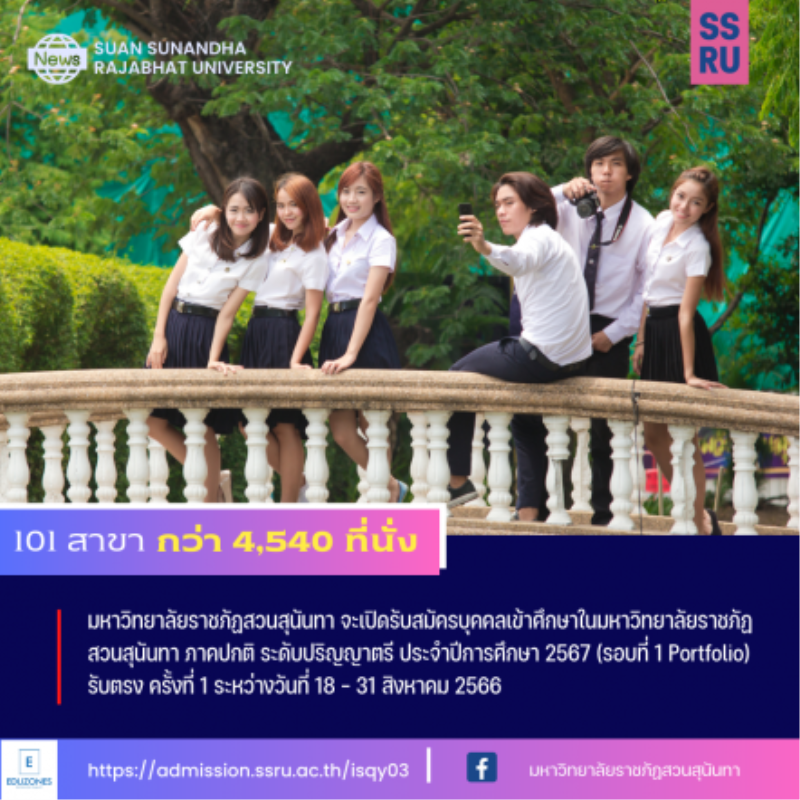 tui sakrapee September 8, 2022 ที่นั่งยังรออยู่! สวนสุนันทา เปิดรับ Dek’66 รอบที่ 1 Portfolio เตรียมรับโอกาสดี ๆ ก่อนใคร ยื่นได้วันนี้ ถึง 30ก.ย.65 tui sakrapee September 8, 2022 มหาวิทยาลัยราชภัฏสวนสุนันทา มีความประสงค์จะเปิดรับสมัครบุคคลเข้าศึกษาในมหาวิทยาลัยราชภัฏสวนสุนันทาภาคปกติ ระดับปริญญาตรี ประจำปีการศึกษา 2566 (รอบที่ 1 Portfolio) รับตรงระหว่างวันที่ 16 สิงหาคม 2565 – 30 กันยายน 2565 จึงขอประกาศรายละเอียดเกี่ยวกับการรับสมัครสอบคัดเลือกดังนี้ จำนวนที่จะรับ จำแนกตามหลักสูตร สาขาวิชา และรหัสวิชาสอบ หมายเหตุ : 1. ผู้สมัครที่เลือกสมัครสาขาวิชาที่ศูนย์การศึกษา/วิทยาเขต นั้น กรณีที่สอบผ่านการคัดเลือก และยืนยันสิทธิ์เข้าศึกษาต้องไปเข้าศึกษาตามศูนย์ที่กำหนดในประกาศรับสมัคร 2. มหาวิทยาลัยฯ ขอสงวนสิทธิ์ในการเปิด/ปิด สาขาวิชาที่มีจำนวนรับไม่เป็นไปตามแผนรับ คุณสมบัติและพื้นความรู้ของผู้สมัครสอบ… Continue Reading