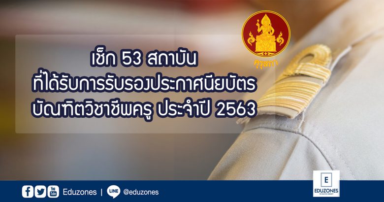 EZ Webmaster July 12, 2020 เช็ก 53 สถาบันที่ได้รับการรับรองประกาศนียบัตรบัณฑิตวิชาชีพครู ประจำปี 2563 EZ Webmaster July 12, 2020 ในการประชุม ครั้งที่ 4/2563 เมื่อวันที่ 15 มิถุนายน 2563 ที่ผ่านมาทางคณะกรรมการคุรุสภา ได้มีมติในการรับรองหลักสูตรประกาศนียบัตรบัณฑิตวิชาชีพครู เพิ่มเติม จำนวน 1 แห่ง ได้แก่ ประกาศนียบัตรบัณฑิต สาขาวิชาชีพครู หลักสูตรปรับปรุง พ.ศ. 2562 ของมหาวิทยาลัยราชภัฏอุบลราชธานี โดยมีแผนการรับนักศึกษา จำนวน 180 คน ดังนั้น ในปี 2563 นี้ จึงมีสถาบันที่ได้รับการรับรองประกาศนียบัตรบัณฑิตวิชาชีพครู ประจำปี 2563… Continue Reading