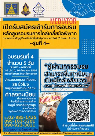 tui sakrapee August 2, 2023 วิทยาลัยทองสุข เปิดอบรมหลักสูตรไกล่เกลี่ยข้อพิพาท รุ่นที่ 4 รับจำกัด 50 ที่นั่ง tui sakrapee August 2, 2023 วิทยาลัยทองสุข เปิดอบรมหลักสูตรไกล่เกลี่ยข้อพิพาท รุ่นที่ 4 รับจำนวนจำกัด 50 ท่านเท่านั้น วิทยาลัยทองสุข เปิดรับสมัครบุคคลทั่วไปที่สนใจเข้ารับการอบรมหลักสูตรอบรมการไกล่เกลี่ยข้อพิพาทตามพระราชบัญญัติการไกล่เกลี่ยข้อพิพาท พ.ศ. 2562 (กพยช. รับรอง และได้รับประกาศนียบัตรหลังการอบรม) รับสมัครตั้งแต่วันนี้เป็นต้นไป เริ่มอบรม 2,3,9,10,16 กันยายน 2566 ค่าใช้จ่าย 6,900-. บาท ชำระโดย ชื่อบัญชี วิทยาลัยทองสุข ธนาคารกรุงไทย 0310545706 https://forms.gle/woVgpWovZttY83nK9 **คุณสมบัติผู้เรียน ต้องเป็นผู้ที่มีอายุไม่ต่ำกว่า 30 ปีบริบูรณ์**… Continue Reading