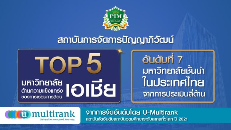 สถาบันการจัดการปัญญาภิวัฒน์ (PIM) ติด Top 5 เอเชีย มหาวิทยาลัยด้านความแข็งแกร่งของการเรียนการสอนในระดับ A และ ติดอันดับ 7 มหาวิทยาลัยชั้นนำไทยจากการประเมินสี่ด้าน ซึ่งจัดอันดับโดย U-Multirank สถาบันจัดอันดับสถาบันอุดมศึกษาระดับสากลทั่วโลก ปี 2021 U-Multirank สถาบันจัดอันดับสถาบันอุดมศึกษา ซึ่งได้รับทุนสนับสนุนจากสหภาพยุโรป (The European Commission’s Erasmus+ Programme) ดำเนินการโดยนักวิชาการจากสถาบันการศึกษาต่างๆ ในทวีปยุโรปเพื่อประเมินมหาวิทยาลัยที่เข้าร่วมโครงการ ได้ประกาศผลการจัดอันดับมหาวิทยาลัยอย่างเป็นทางการ ประจำปี 2021 โดยในปีนี้มีมหาวิทยาลัยเข้าร่วมกว่า 1,948 แห่ง จาก 97 ประเทศทั่วโลก และมีมหาวิทยาลัยในประเทศไทย 51 แห่งเข้าร่วมประเมินดังกล่าว…