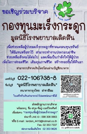 tui sakrapee March 4, 2023 ศรัทธา รวมใจ ร่วมพลัง สร้างบุญ เพื่อผู้ป่วยโรคมะเร็งกระดูก Lerdsin Sarcoma Day tui sakrapee March 4, 2023 หน่วยเนื้องอกและมะเร็งกระดูก สถาบันออร์โธปิดิกส์ โรงพยาบาลเลิดสิน นำทีมโดย นายแพทย์ปิยะ เกียรติเสวี, นายแพทย์ภาสนันต์ สุคันธนาค, นายแพทย์พงศ์ศิริ เปียคง, นายแพทย์ปุณณวิช พินิจชานนท์ และ น.ส.มานดาร์ เจริญราษฎร์ (เลขาฯ) ร่วมจัดงาน Lerdsin Sarcoma Day ในวันศุกร์ที่ 31 มีนาคม 2566 ณ ห้องประชุมชั้น 25 อาคารกาญจนาภิเษก โรงพยาบาลเลิดสิน เวลา 08.30-15.00… Continue Reading