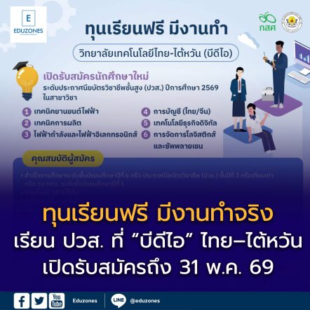 EZ Webmaster October 17, 2025 วิทยาลัยเทคโนโลยีไทย-ไต้หวัน (บีดีไอ) เปิดรับนักศึกษาทุนระดับประกาศนียบัตรวิชาชีพชั้นสูง EZ Webmaster October 17, 2025 วิทยาลัยเทคโนโลยีไทย-ไต้หวัน (บีดีไอ) เปิดรับนักศึกษาทุนระดับประกาศนียบัตรวิชาชีพชั้นสูง (ปวส.) ประจำปีการศึกษา 2568 พร้อมรับประสิทธิประโยชน์ที่ครอบคลุม ด้านวิชาการ การฝึกทักษะอาชีพที่รองรับการพัฒนาอุตสาหกรรม 4.0 ผ่านการลงมือปฏิบัติงานจริงกับเครื่องมือ เครื่องจักร และอุปกรณ์ที่ทันสมัย โอกาสทัศนศึกษาดูงานที่ประเทศไต้หวันที่ขึ้นชื่อด้านเทคโนโลยีอุตสาหกรรม และการได้ทำงานจริงกับบริษัทชั้นนำหลังจบการศึกษา หรือต่อยอดโอกาสทางการศึกษาในระดับชั้นปริญญาตรีต่อเนื่องทั้งในสถาบันในไทยและประเทศไต้หวัน . สาขาวิชาชีพที่เปิดรับ เทคนิคยานยนต์ไฟฟ้า ไฟฟ้ากำลัง ไฟฟ้าอิเล็กทรอนิกส์ เทคนิคการผลิต การบัญชี (ไทย/จีน) เทคโนโลยีธุรกิจดิจิทัล การจัดการโลจิสติกส์และซัพพลายเชน . เปิดรับสมัคร ตั้งแต่วันนี้ – 31 พฤษภาคม… Continue Reading