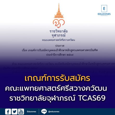 EZ Webmaster August 9, 2025 เกณฑ์การรับสมัครบุคคลเข้าศึกษา คณะแพทยศาสตร์ศรีสวางควัฒน ราชวิทยาลัยจุฬาภรณ์ TCAS69 EZ Webmaster August 9, 2025 ประกาศคณะแพทยศาสตร์ศรีสวางควัฒน เรื่อง เกณฑ์การรับสมัครบุคคลเข้าศึกษา หลักสูตรแพทยศาสตรบัณฑิต ประจำปีการศึกษา 2569 โดยกำหนดรับนักศึกษา รวมจำนวน 32 คน ผ่านระบบรับสมัคร จำนวน 3 รอบ ดังนี้ รอบที่ 1 Portfolio (โครงการเพชรจุฬาภรณ์) จำนวน 14 คน รอบที่ 2 Quota (โครงการปณิธานจุฬาภรณ์) จำนวน 4 คน รอบที่ 3 กลุ่มสถาบันแพทยศาสตร์แห่งประเทศไทย… Continue Reading
