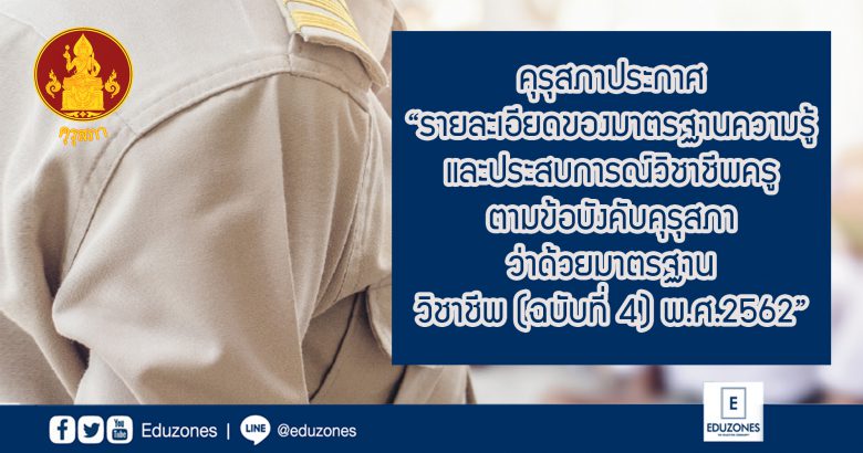EZ Webmaster June 23, 2020 คุรุสภาประกาศ “รายละเอียดของมาตรฐานความรู้และประสบการณ์วิชาชีพครูตามข้อบังคับคุรุสภา ว่าด้วยมาตรฐานวิชาชีพ (ฉบับที่ 4) พ.ศ.2562” EZ Webmaster June 23, 2020 เมื่อวันที่ 22 มิถุนายน 2563 ที่ผ่านมา ทางสำนักงานคณะกรรมการคุรุสภา ได้มีประกาศคณะกรรมการคุรุสภา เรื่อง รายละเอียดของมาตรฐานความรู้และประสบการณ์วิชาชีพครูตามข้อบังคับคุรุสภา ว่าด้วยมาตรฐานวิชาชีพ (ฉบับที่ 4) พ.ศ.2562 โดยมีเนื้อหาตามประกาศ ดังนี้ อาศัยอํานาจตามความในข้อ 6 และข้อ 10 แห่งข้อบังคับคุรุสภา ว่าด้วยมาตรฐานวิชาชีพ พ.ศ. 2556 ซึ่งแก้ไขเพิ่มเติมโดยข้อบังคับคุรุสภา ว่าด้วยมาตรฐานวิชาชีพ (ฉบับที่ 4) พ.ศ. 2562 ประกอบกับมติคณะกรรมการคุรุสภา… Continue Reading