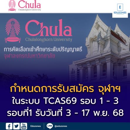 EZ Webmaster August 8, 2025 กำหนดการรับสมัคร จุฬาฯ ในระบบ TCAS69 EZ Webmaster August 8, 2025 TCAS รอบที่ 1 : PORTFOLIO – รับสมัคร : 3-17 พ.ย. 68 – สอบสัมภาษณ์ : รอประกาศ – ช่องทางสมัคร : https://admission.chula.ac.th . TCAS รอบที่ 2 : QUOTA – รับสมัคร : 12-23 ก.พ. 69 –… Continue Reading