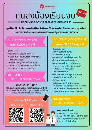 EZ Webmaster October 22, 2025 มูลนิธิอายิโนะโมะโต๊ะ เปิดรับสมัคร “ทุนส่งน้องเรียนจบ” ปีการศึกษา 2568 EZ Webmaster October 22, 2025 🎓 มูลนิธิอายิโนะโมะโต๊ะ เปิดรับสมัคร “ทุนส่งน้องเรียนจบ” ปีการศึกษา 2568 ต่อเนื่องเป็นปีที่ 20 เพื่อช่วยเหลือเยาวชนไทยที่เรียนดีแต่ขาดแคลนทุนทรัพย์ ให้สามารถเรียนจบและเติบโตเป็นเยาวชนต้นแบบของสังคม โดยเปิดรับทั้งในระดับ อาชีวศึกษา และ อุดมศึกษา รวมกว่า 65 ทุนทั่วประเทศ 📘 ระดับอาชีวศึกษา เปิดรับสมัครสำหรับ ระดับ ปวช. ปี 1 จำนวน 15 ทุน ทุนละ 15,000 บาท ระดับ ปวส.… Continue Reading