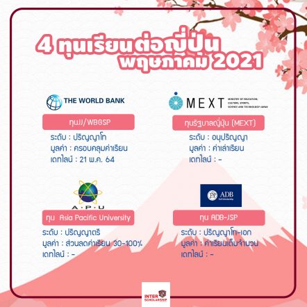 EZ Webmaster May 18, 2021 4 ทุนเรียนต่อประเทศญี่ปุ่น อัพเดตเดือนพฤษภาคม 2021 EZ Webmaster May 18, 2021 ถ้าพูดถึงประเทศที่หลายคนสนใจไปเรียนต่อในแถบเอเชียแล้ว ประเทศยอดฮิตที่เราต้องนึกถึงเป็นอันดับแรกๆ เลยก็คือ “ประเทศญี่ปุ่น” เพราะเป็นประเทศที่มีระบบการศึกษาที่มีคุณภาพ มีภาษา วัฒนธรรมที่น่าหลงใหล รวมถึงเศรษฐกิจและเทคโนโลยีที่ก้าวหน้าอันดับต้นๆ ของโลก วันนี้เราจึงมี 4 ทุนเรียนประเทศญี่ปุ่น ที่เปิดรับสมัครในช่วงนี้มาฝากกันค่ะ 1.ทุนJJ/WBGSP ทุน JJ/WBGSP หรือ Japan/World Bank graduate scholarship program ประจำปี 2021 เป็นทุนระดับปริญญาโท สำหรับผู้ที่มีประสบการณ์ด้านการพัฒนามาไม่น้อยกว่า 3 ปี นับตั้งแต่จบปริญญาตรี ทุนนี้จะครอบคลุมที่ค่าเล่าเรียนสำหรับหลักสูตรระดับบัณฑิตศึกษาตลอดโปรแกรม (2… Continue Reading