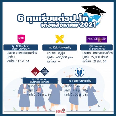 EZ Webmaster August 19, 2021 อัปเดต 5 ทุนเรียนต่อป.โท เดือนสิงหาคม ปี 2021 EZ Webmaster August 19, 2021 สำหรับผู้ที่กำลังศึกษาในอยู่ระดับปริญญาตรีแล้วสนใจอยากศึกษาต่อต่างประเทศในระดับปริญญาโท วันนี้เราได้มีทุนการศึกษาสำหรับการเรียนต่อต่างประเทศในระดับปริญญาโท อัปเดตเดือนสิงหาคม ปี 2021 มาฝากกันค่ะ 1.ทุน Nottingham Trent University ทุน Postgraduate international awards จาก Nottingham Trent University สหราชอาณาจักร เป็นทุนการศึกษาต่อในระดับปริญญาโท ไม่จำกัดสาขา ประจำปีการศึกษา 2021-2022 โดยจะเปิดรับสมัครถึงวันที่ 1 ตุลาคม 2021 รายละเอียดคลิก >>> http://th.interscholarship.com/somkiat2013/4572 … Continue Reading