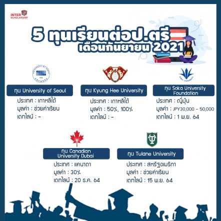 EZ Webmaster September 26, 2021 4 ทุนเรียนต่อป.โท-เอก อัปเดตเดือนกันยายน 2021 EZ Webmaster September 26, 2021 สำหรับน้องๆ นักศึกษาระดับปริญญาตรีหรือผู้ที่สนใจศึกษาต่อในระดับบัณฑิตศึกษาที่ต่างประเทศ วันนี้เราได้รวบรวมทุนเรียนต่อระดับปริญญาโทและเอก อักเดตเดือนกันยายน ปี 2021 มาฝากกันค่ะ 1.ทุน Kyungpook National University ทุน KNU International Graduate Scholarship in South Korea ของ Kyungpook National University ประเทศเกาหลีใต้ เป็นทุนในระดับปริญญาโทและเอก ที่ช่วยเหลือค่าเรียนทั้งหมดตลอดโปรแกรมการศึกษา โดยจะเปิดรับใบสมัครถึงวันที่ 1 พฤศจิกายน 2021 รายละเอียดคลิก… Continue Reading
