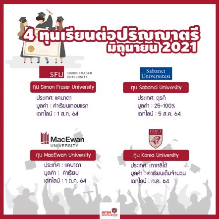 EZ Webmaster July 20, 2021 รวม 6 ทุนป.โทที่ต่างประเทศ อัพเดทเดือนกรกฎาคม 2021 EZ Webmaster July 20, 2021 สำหรับผู้ที่กำลังศึกษาในอยู่ระดับปริญญาตรี หรือคนที่สนใจอยากศึกษาต่อต่างประเทศในระดับปริญญาโท วันนี้เราได้รวบรวมทุนเรียนต่อต่างประเทศในระดับปริญญาโท อัพเดทเดือนกรกฎาคม ปี 2021 ทั้ง 6 ทุนการศึกษา มาฝากกันค่ะ 1.ทุน University of Canterbury ทุน Guardian Trust Master’s Scholarship ในสาขา Commerce ของมหาวิทยาลัย University of Canterbury ประเทศนิวซีแลนด์ เปิดให้ทุนมูลค่า $16,500 โดยจะเปิดรับใบสมัครถึงวันที่ 15 ตุลาคม… Continue Reading