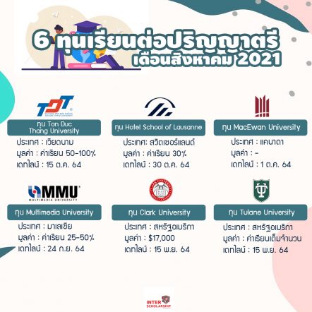 EZ Webmaster August 13, 2021 อัพเดท 6 ทุนเรียนต่อป.ตรี เดือนสิงหาคม ปี 2021 EZ Webmaster August 13, 2021 สำหรับน้องๆ ที่กำลังศึกษาในอยู่ระดับชั้นมัธยมศึกษาปีที่ 6 หรือผู้ที่สนใจอยากศึกษาต่อต่างประเทศในระดับปริญญาตรี วันนี้เราได้รวบรวมทุนที่น่าสนใจสำหรับการเรียนต่อต่างประเทศในระดับปริญญาตรี อัพเดทเดือนสิงหาคม ปี 2021 มาฝากกันค่ะ 1.ทุน Ton Duc Thang University Ton Duc Thang University ประเทศเวียดนาม เปิดให้ทุนสำหรับนักศึกษาจากนานาชาติ ในการมาศึกษาต่อระดับปริญญาตรี ประจำปีการศึกษา 2021-2022 จำนวน 200 ทุน โดยทุนนี้จะครอบคลุมค่าเรียน 50-100% ซึ่งจะเปิดรับใบสมัครถึงวันที่ 15 ตุลาคม… Continue Reading