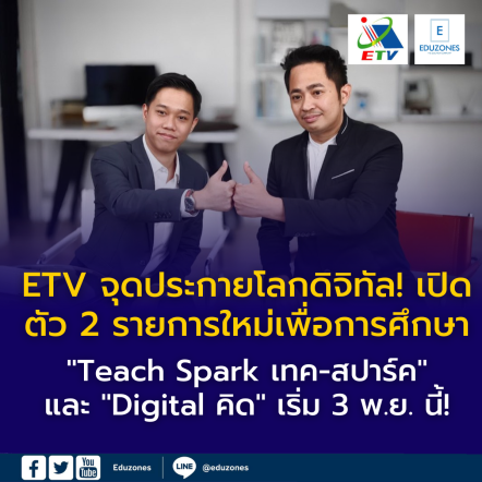 EZ Webmaster October 31, 2025 ETV จุดประกายโลกดิจิทัล! เปิดตัว 2 รายการใหม่เพื่อการศึกษา “Teach Spark เทค-สปาร์ค” และ “Digital คิด” เริ่ม 3 พ.ย. นี้! EZ Webmaster October 31, 2025 ETV จุดประกายโลกดิจิทัล! เปิดตัว 2 รายการใหม่เพื่อการศึกษา “Teach Spark เทค-สปาร์ค” และ “Digital คิด” เริ่ม 3 พ.ย. นี้! สถานีวิทยุโทรทัศน์เพื่อการศึกษา กระทรวงศึกษาธิการ (ETV) บ้านหลังใหญ่แห่งการเรียนรู้ ขอเชิญชวนนักเรียน ครู อาจารย์ และประชาชนทั่วไป ร่วมเปิดโลกแห่งเทคโนโลยีดิจิทัลอย่างสร้างสรรค์และเข้าใจง่าย ผ่าน 2 รายการเพื่อการศึกษารูปแบบใหม่ ที่จะ “จุดประกายความคิดและทักษะดิจิทัลในตัวคุณ” ให้ก้าวทันต่อการเปลี่ยนแปลงของโลกยุคปัจจุบัน … Continue Reading