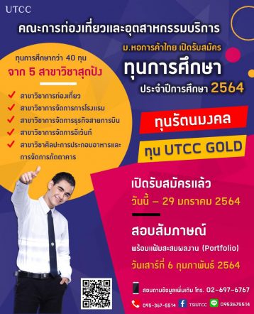 tui sakrapee December 16, 2020 คณะการท่องเที่ยวฯ มหาวิทยาลัยหอการค้าไทย เปิดรับสมัครทุนรัตนมงคล’2564 tui sakrapee December 16, 2020 คณะการท่องเที่ยวและอุตสาหกรรมการบริการ มหาวิทยาลัยหอการค้าไทย เปิดรับสมัครทุนการศึกษา ประจำปีการศึกษา 2564 เฟ้นหานักศึกษาเรียนดี กิจกรรมเด่น มีความสามารถ ชิงทุนการศึกษากว่า 40 จาก 5 สาขาวิชาสุดฮิตที่ตอบโจทย์ทุกธุรกิจบริการในยุค New Normal สาขาวิชาการท่องเที่ยว สาขาวิชาการจัดการการโรงแรม สาขาวิชาการจัดการธุรกิจสายการบิน สาขาวิชาการจัดการอีเว้นท์ สาขาวิชาศิลปะการประกอบอาหารและการจัดการภัตตาคาร เปิดรับสมัครตั้งแต่วันนี้ – 29 มกราคม 2564 สามารถสมัครทุนการศึกษาได้ 2 ช่องทาง ดังนี้ 1. สมัครผ่านทางศูนย์รับสมัครนักศึกษา อาคาร 24… Continue Reading