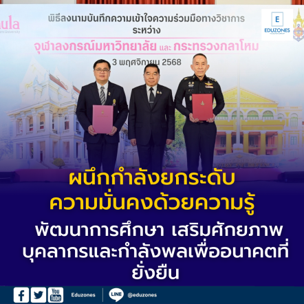 EZ Webmaster November 4, 2025 จุฬาฯ – กระทรวงกลาโหม ผนึกกำลังยกระดับความมั่นคงด้วยความรู้ พัฒนาการศึกษา เสริมศักยภาพบุคลากรและกำลังพลเพื่ออนาคตที่ยั่งยืน EZ Webmaster November 4, 2025 จุฬาฯ – กระทรวงกลาโหม ผนึกกำลังยกระดับความมั่นคงด้วยความรู้ พัฒนาการศึกษา เสริมศักยภาพบุคลากรและกำลังพลเพื่ออนาคตที่ยั่งยืน จุฬาลงกรณ์มหาวิทยาลัยร่วมมือกระทรวงกลาโหม ลงนามบันทึกความเข้าใจความร่วมมือทางวิชาการ เพื่อยกระดับการศึกษา การวิจัย และนวัตกรรมด้านความมั่นคง พร้อมเสริมศักยภาพบุคลากรและกำลังพลผ่านหลักสูตร ฝึกอบรม และการแลกเปลี่ยนองค์ความรู้ สร้างเครือข่ายความร่วมมือเพื่ออนาคตที่มั่นคงและยั่งยืนของประเทศ พิธีลงนามบันทึกความเข้าใจความร่วมมือทางวิชาการ ระหว่างจุฬาลงกรณ์มหาวิทยาลัยและกระทรวงกลาโหม จัดขึ้นเมื่อวันจันทร์ที่ 3 พฤศจิกายน 2568 ณ ห้อง 111 อาคารมหาจุฬาลงกรณ์ โดยมี พล.อ.ณัฐพล นาคพาณิชย์ รัฐมนตรีว่าการกระทรวงกลาโหม เป็นสักขีพยานและแถลงถึงความร่วมมือในการส่งเสริมพัฒนาการศึกษาของบุคลากรและกำลังพลกระทรวงกลาโหม … Continue Reading