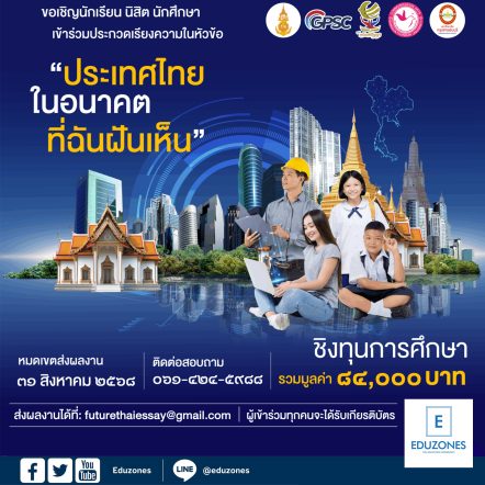 EZ Webmaster July 13, 2025 ม.กรุงเทพธนบุรี ชวนนักเรียน นักศึกษา ส่งประกวดเรียงความ หัวข้อ “ประเทศไทยในอนาคต ที่ฉันฝันเห็น” ชิงทุนการศึกษารวมมูลค่า 84,000 บาท EZ Webmaster July 13, 2025 🎓 ขอเชิญนักเรียน นิสิต นักศึกษา เข้าร่วมประกวดเรียงความ หัวข้อ ประเทศไทยในอนาคต ที่ฉันฝันเห็น” 📍 จัดโดย มูลนิธิทรัพย์ปัญญา ร่วมกับ กองทัพเรือ บริษัท GPSC และ คณะนิเทศศาสตร์ ม.กรุงเทพธนบุรี 📬 ส่งผลงานได้ที่: futurethaiessay@gmail.com 📅 หมดเขตส่งผลงาน: ๓๑ สิงหาคม ๒๕๖๘ 🏆 ชิงทุนการศึกษารวมมูลค่า ๘๔,๐๐๐ บาท 📜… Continue Reading