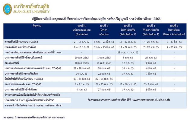 มทร.ธัญบุรี พร้อมปั้นบัณฑิตสู่ยุค NEXT GEN การันตีความสำเร็จด้วยคลื่นมหาชน tui sakrapeeDecember 4, 2025 มหาวิทยาลัยเทคโนโลยีราชมงคลธัญบุรี (มทร.ธัญบุรี) สร้างปรากฏการณ์ครั้งสำคัญในแวดวงการศึกษาไทยผ่านงาน ‘RMUTT NEXT GEN: Open House 2026 : เปิดประตูสู่ราชมงคลธัญบุรี 69’ เมื่อวันที่ 27 และ 28 พฤศจิกายน 2568… ม.กรุงเทพ จัดงาน The Shape of Tomorrow: Bangkok Art & Architecture @Dib Bangkok tui sakrapeeDecember 4, 2025 คณะสถาปัตยกรรมศาสตร์ มหาวิทยาลัยกรุงเทพ จัดงาน “The Shape of Tomorrow: Bangkok Art & Architecture” เปิดพื้นที่แลกเปลี่ยนองค์ความรู้และประสบการณ์ระหว่างนักวิชาการ ผู้เชี่ยวชาญในวงการสถาปัตยกรรมที่มุ่งเน้นแนวคิดการออกแบบที่ตอบโจทย์ความยั่งยืน (Sustainability) และการปรับใช้พื้นที่อาคารให้เกิดคุณค่าใหม่ (Adaptive Reuse) โดยปรับเปลี่ยนพื้นที่เดิมให้กลายเป็นพื้นที่สร้างสรรค์อย่าง… มหาวิทยาลัยราชภัฏสวนสุนันทา จับมือ “เอ็ม พาวเวอร์ คอร์ปอเรชั่น” ลงนาม MOU ขับเคลื่อนระบบจัดการวัสดุรีไซเคิล สู่มหาวิทยาลัยสีเขียวอย่างยั่งยืน tui sakrapeeDecember 4, 2025 เมื่อวันพฤหัสบดีที่ 4 ธันวาคม 2568 มหาวิทยาลัยราชภัฏสวนสุนันทา จัดพิธีลงนามบันทึกความเข้าใจ (MOU) ร่วมกับบริษัท เอ็ม พาวเวอร์ คอร์ปอเรชั่น จำกัด ณ ห้องประชุมสภามหาวิทยาลัย เพื่อขับเคลื่อนการพัฒนาระบบการจัดการวัสดุรีไซเคิลภายในมหาวิทยาลัยอย่างเป็นรูปธรรมและยั่งยืน พิธีลงนามในครั้งนี้มีวัตถุประสงค์เพื่อพัฒนากลไกการจัดการวัสดุรีไซเคิลให้มีประสิทธิภาพยิ่งขึ้น ส่งเสริมการคัดแยกขยะอย่างถูกต้อง เพิ่มคุณค่าและสร้างรายได้จากวัสดุที่สามารถนำกลับมาใช้ใหม่… สุดเจ๋ง! สถานศึกษาอาชีวะ รับรางวัลโครงการชีววิถีฯ ระดับประเทศ ประจำปี 2568 สานต่อปณิธานหลักปรัชญาเศรษฐกิจพอเพียงของพ่อหลวงรัชกาลที่ 9 EZ WebmasterDecember 3, 2025 สุดเจ๋ง! สถานศึกษาอาชีวะ รับรางวัลโครงการชีววิถีฯ ระดับประเทศ ประจำปี 2568 สานต่อปณิธานหลักปรัชญาเศรษฐกิจพอเพียงของพ่อหลวงรัชกาลที่ 9 วันนี้ (1 ธ.ค. 68) นายยศพล เวณุโกเศศ เลขาธิการคณะกรรมการการอาชีวศึกษา มอบหมายให้ นายสง่า แต่เชื้อสาย… Search for: Search Tag: ม.สวนดุสิต EZ Webmaster November 20, 2019 รายละเอียดการรับสมัครในระบบ TCAS63 รอบที่ 1 Portfolio ม.สวนดุสิต EZ Webmaster November 20, 2019 กำหนดการรับสมัคร รับสมัคร 2-16 ธ.ค. ที่ http://entrance.dusit.ac.th/ สาขาที่เปิดรับ สาขาวิชาธุรกิจการบิน (ศูนย์หัวหิน) จำนวน 150 คน ระเบียบการรับสมัคร http://entrance.dusit.ac.th/page/portfolio.html Continue Reading EZ Webmaster October 16, 2019 กำหนดการการรับในระบบ TCAS63 ทั้ง 5 รอบ ของ ม.สวนดุสิต EZ Webmaster October 16, 2019 รอบที่ 1 Portfolio 150 คน รอบที่ 2 โควตา 620 คน รอบที่ 3 รับตรงร่วมกัน 1,570 คน รอบที่ 4 รับกลางร่วมกัน 1,550 คน ยอดรับรวม 3,890 คน ดูรายละเอียดที่ >> http://entrance.dusit.ac.th #dek63 Continue Reading EZ Webmaster May 30, 2019 TCAS62 รอบที่ 5 รับตรงอิสระ ม.สวนดุสิต 2562 EZ Webmaster May 30, 2019 กำหน