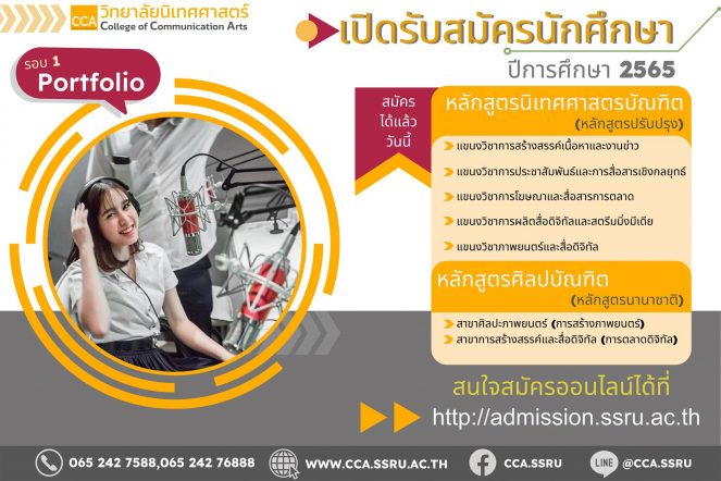 tui sakrapee December 7, 2021 ตอบโจทย์อนาคต! วิทยาลัยนิเทศศาสตร์ สวนสุนันทา เปิดรับเรียนต่อปริญญาตรี ปี 65 ปรับปรุงใหม่ครบถ้วนทั้งหลักสูตรภาษาไทยและนานาชาติ tui sakrapee December 7, 2021 วิทยาลัยนิเทศศาสตร์ มหาวิทยาลัยราชภัฏสวนสุนันทา เปิดรับสมัครนักศึกษาระดับปริญญาตรี ประจำปีการศึกษา 2565 หลักสูตรภาษาไทย : นิเทศศาสตรบัณฑิต (นศ.บ.) 5 แขนงวิชา 1.#แขนงวิชาการสร้างสรรค์เนื้อหาและงานข่าว (วิทยาเขตนครปฐม 3338 / ห้องเรียนกรุงเทพ 3335) 2.#แขนงวิชาการประชาสัมพันธ์และการสื่อสารเชิงกลยุทธ์ (วิทยาเขตนครปฐม 3339 / ห้องเรียนกรุงเทพ 3336) 3.#แขนงวิชาการโฆษณาและสื่อสารการตลาด (วิทยาเขตนครปฐม 3332 / ห้องเรียนกรุงเทพ 3322) 4.#แขนงวิชาการผลิตสื่อดิจิทัลและสตรีมมิ่งมีเดีย (วิทยาเขตนครปฐม 3340 / ห้องเรียนกรุงเทพ 3337) 5.#แขนงวิชาภาพยนตร์และสื่อดิจิทัล (วิทยาเขตนครปฐม 3334… Continue Reading